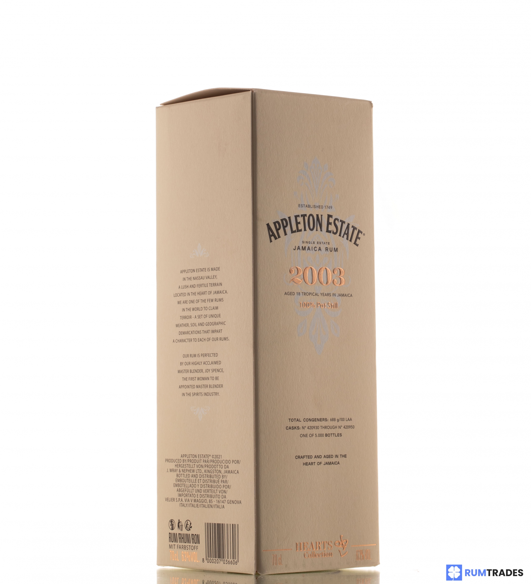 The Appleton Estate, officially founded in 1749, was born in the oldest sugar cane plantation in Jamaica, although the legend tells that the plantation where it stands, was officially planted by Sir Francis Dickenson, English soldier born in "Appleton", a small town in present-day Oxfordshire, Great Britain, which took part in the invasion of the continent almost a hundred years earlier, in 1655. Situated in the heart of the country, in the lush Nassau Valley and crossed by the Black River, since 1916 is owned by Wray & Nephew.  Since 2012, is controlled by the global giant of beverage industry, the Italian Davide Campari-Milano, better known as the Campari Group. The Appleton Hearts Collection is a world premiere: they are the first 3 single marks rum 100% pot still and vintage, in the history of the distillery, selected by Luca Gargano and the legendary Master Blender of Appleton Estate, Joy Spence, the first woman to play this role in the entire distillate industry, since 1997.