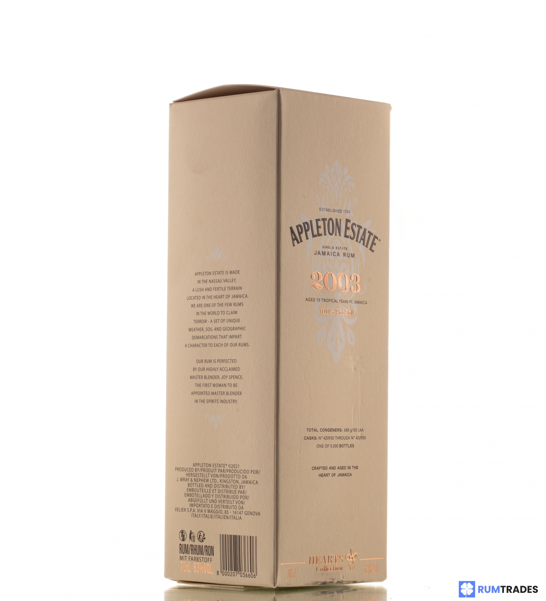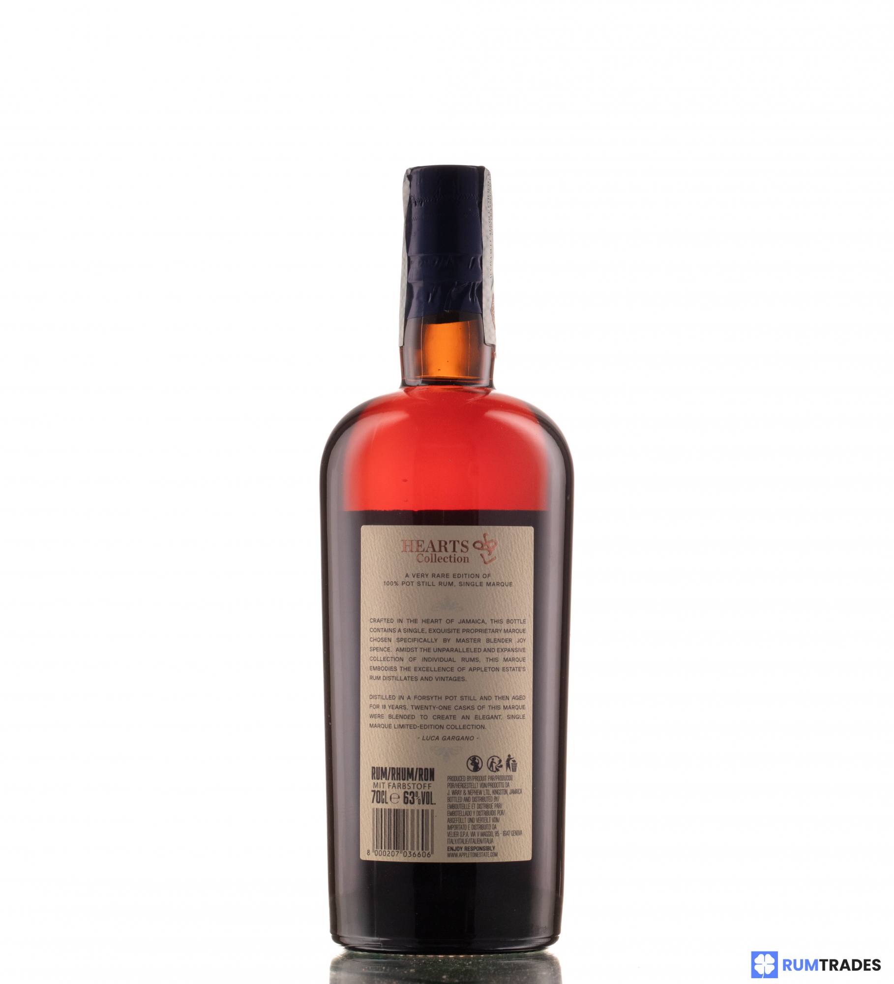 The Appleton Estate, officially founded in 1749, was born in the oldest sugar cane plantation in Jamaica, although the legend tells that the plantation where it stands, was officially planted by Sir Francis Dickenson, English soldier born in "Appleton", a small town in present-day Oxfordshire, Great Britain, which took part in the invasion of the continent almost a hundred years earlier, in 1655. Situated in the heart of the country, in the lush Nassau Valley and crossed by the Black River, since 1916 is owned by Wray & Nephew.  Since 2012, is controlled by the global giant of beverage industry, the Italian Davide Campari-Milano, better known as the Campari Group. The Appleton Hearts Collection is a world premiere: they are the first 3 single marks rum 100% pot still and vintage, in the history of the distillery, selected by Luca Gargano and the legendary Master Blender of Appleton Estate, Joy Spence, the first woman to play this role in the entire distillate industry, since 1997.