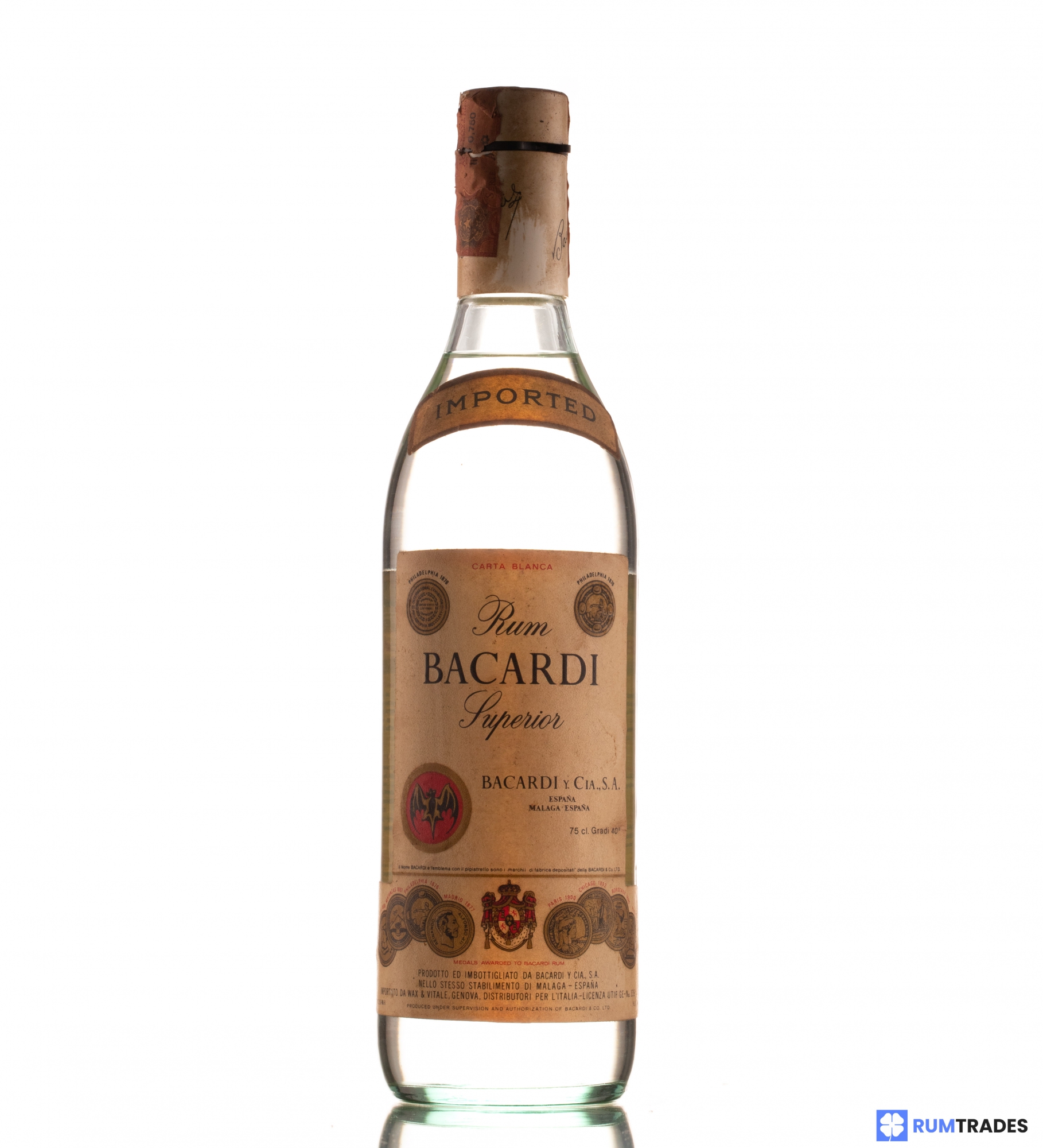 The Bacardi Carta Blanca 40%, a genuine and storied spirit, provides an enlightening glimpse into the distinguished heritage of the Bacardi brand. This particular bottle is a nostalgic emissary from the 1970s, presenting not only a classic rum but also a piece of history. Produced and bottled in Cuba during a vibrant era for rum craftsmanship, it represents a time capsule of the traditional rum-making processes of Bacardi.